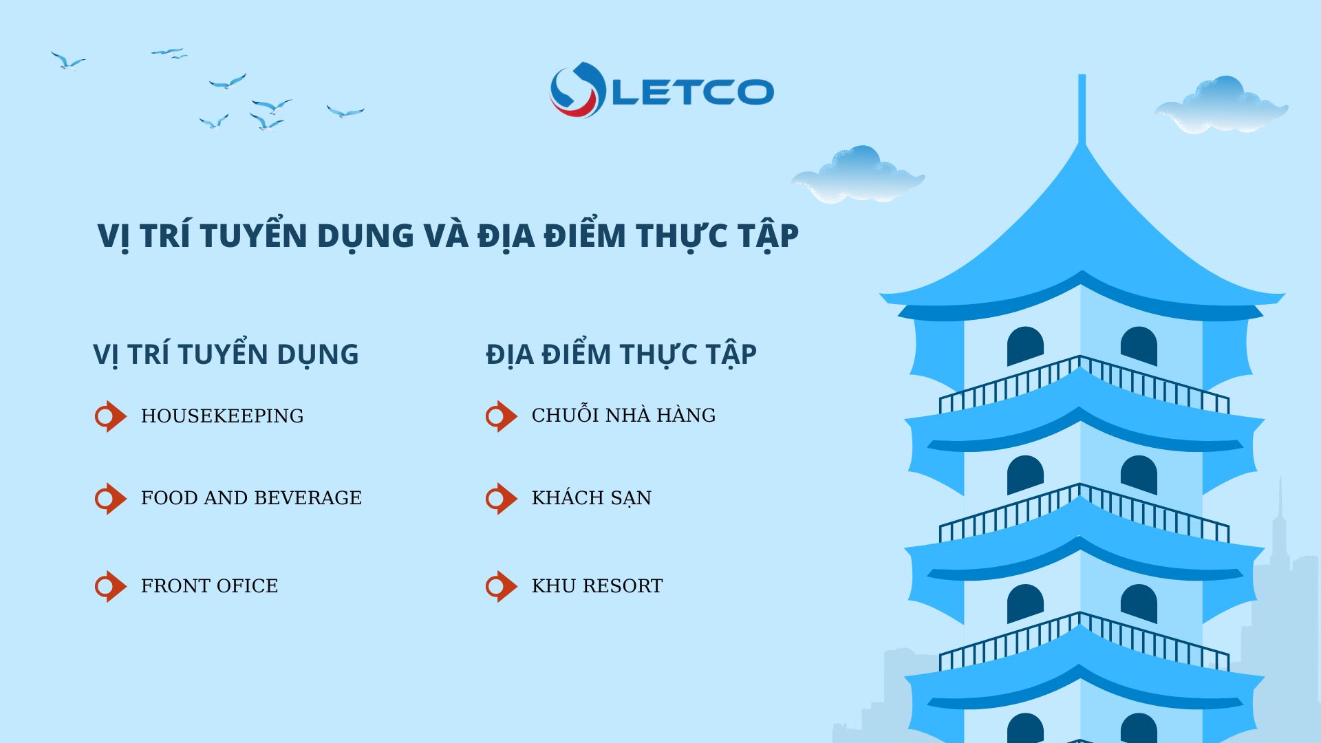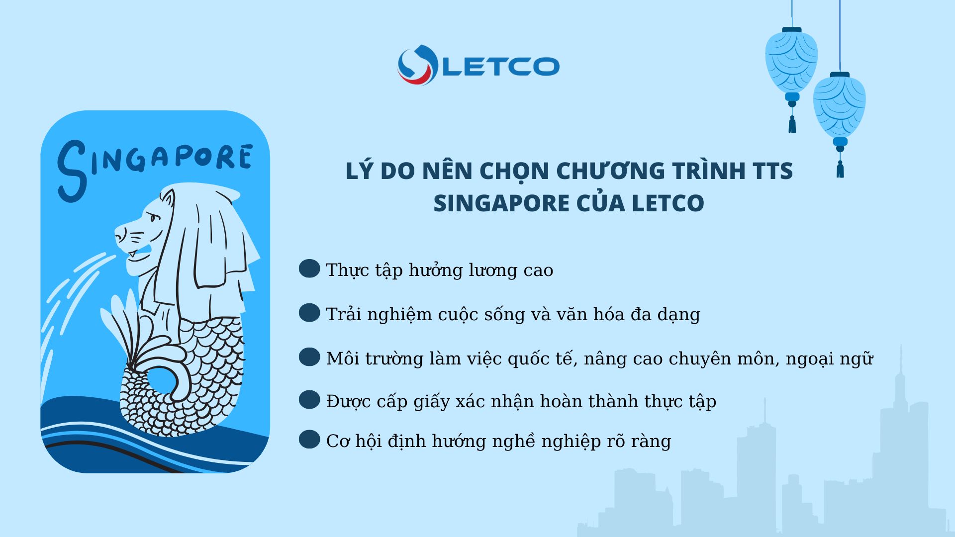 Chương trình thực tập sinh Singapore do LETCO triển khai là cơ hội dành cho sinh viên Việt Nam mong muốn trải nghiệm môi trường làm việc quốc tế chuyên nghiệp, hiện đại và đa văn hóa. Với thời gian thực tập kéo dài 03 tháng, chương trình đặc biệt phù hợp cho sinh viên đang trong giai đoạn thực tập bắt buộc hoặc những bạn trẻ muốn tích lũy kinh nghiệm làm việc tại nước ngoài trong thời gian ngắn nhưng vẫn đảm bảo thu nhập và giá trị nghề nghiệp. Thông qua chương trình, sinh viên không chỉ được làm việc tại các doanh nghiệp, khách sạn, nhà hàng quốc tế uy tín mà còn nâng cao năng lực ngoại ngữ và kỹ năng làm việc thực tế.