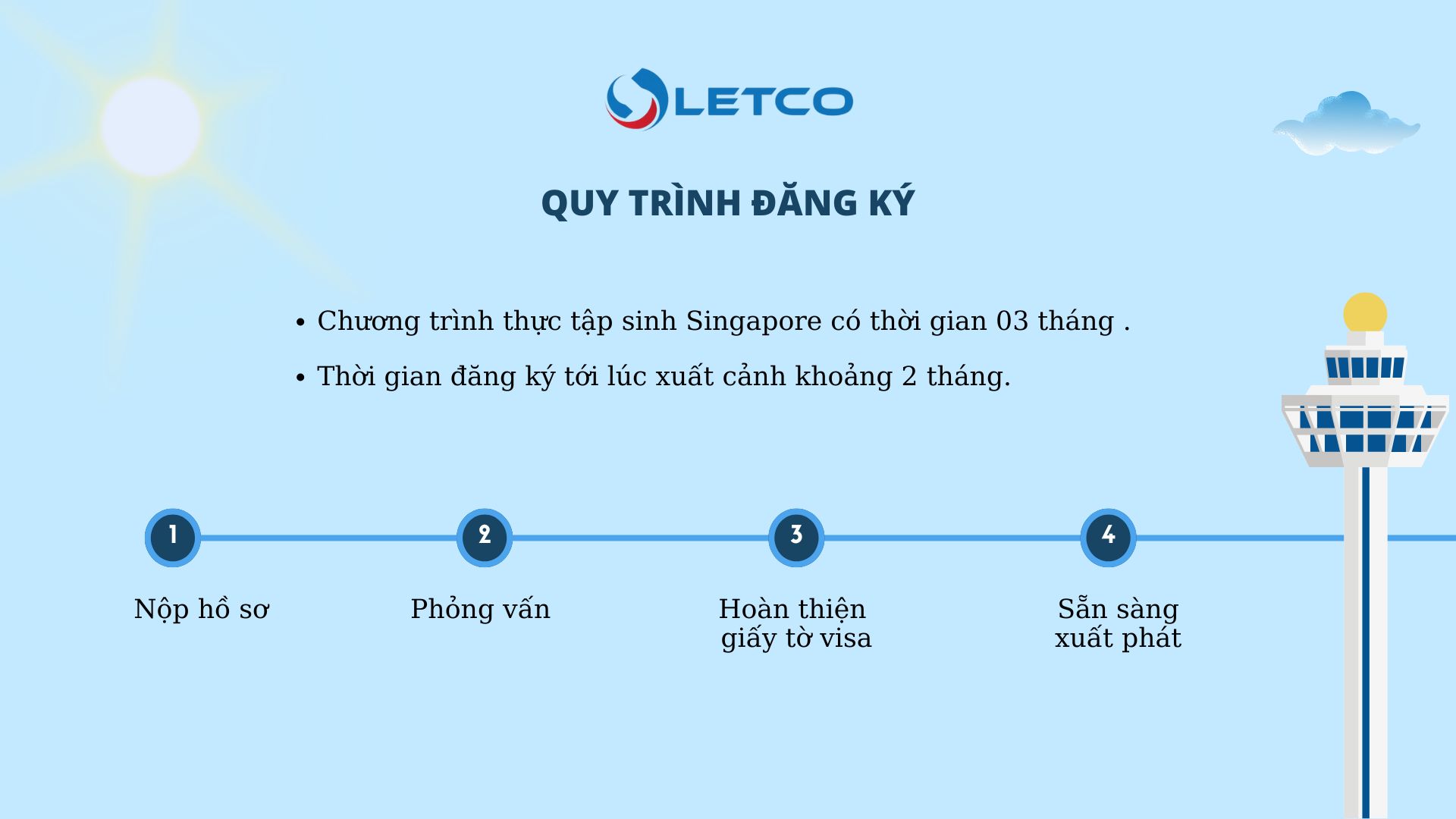 Thời gian từ khi đăng ký chương trình thực tập sinh Singapore đến khi xuất cảnh dự kiến khoảng 02 tháng. Trong thời gian này, LETCO sẽ đồng hành cùng sinh viên xuyên suốt các bước từ nộp hồ sơ, tham gia phỏng vấn trực tiếp với khách sạn hoặc doanh nghiệp tại Singapore, hoàn thiện giấy tờ và thủ tục xin visa cho đến khi sẵn sàng xuất cảnh. Quy trình rõ ràng, minh bạch và được hỗ trợ sát sao giúp sinh viên chủ động và an tâm khi tham gia chương trình.