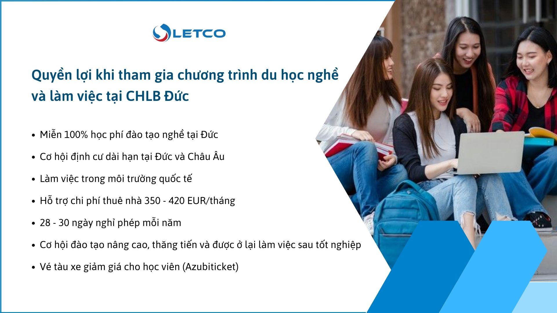 Tham gia chương trình du học nghề và làm việc tại Đức cùng LETCO, học viên được hưởng những quyền lợi toàn diện cả về tài chính lẫn nghề nghiệp. Học phí đào tạo nghề tại Đức được miễn 100%, kèm theo trợ cấp học nghề từ 1.025 – 1.440 EUR/tháng. Doanh nghiệp hỗ trợ tiền thuê nhà từ 350 – 420 EUR/tháng và cung cấp vé tàu xe giảm giá (Azubiticket), giúp học viên tiết kiệm đáng kể chi phí sinh hoạt.