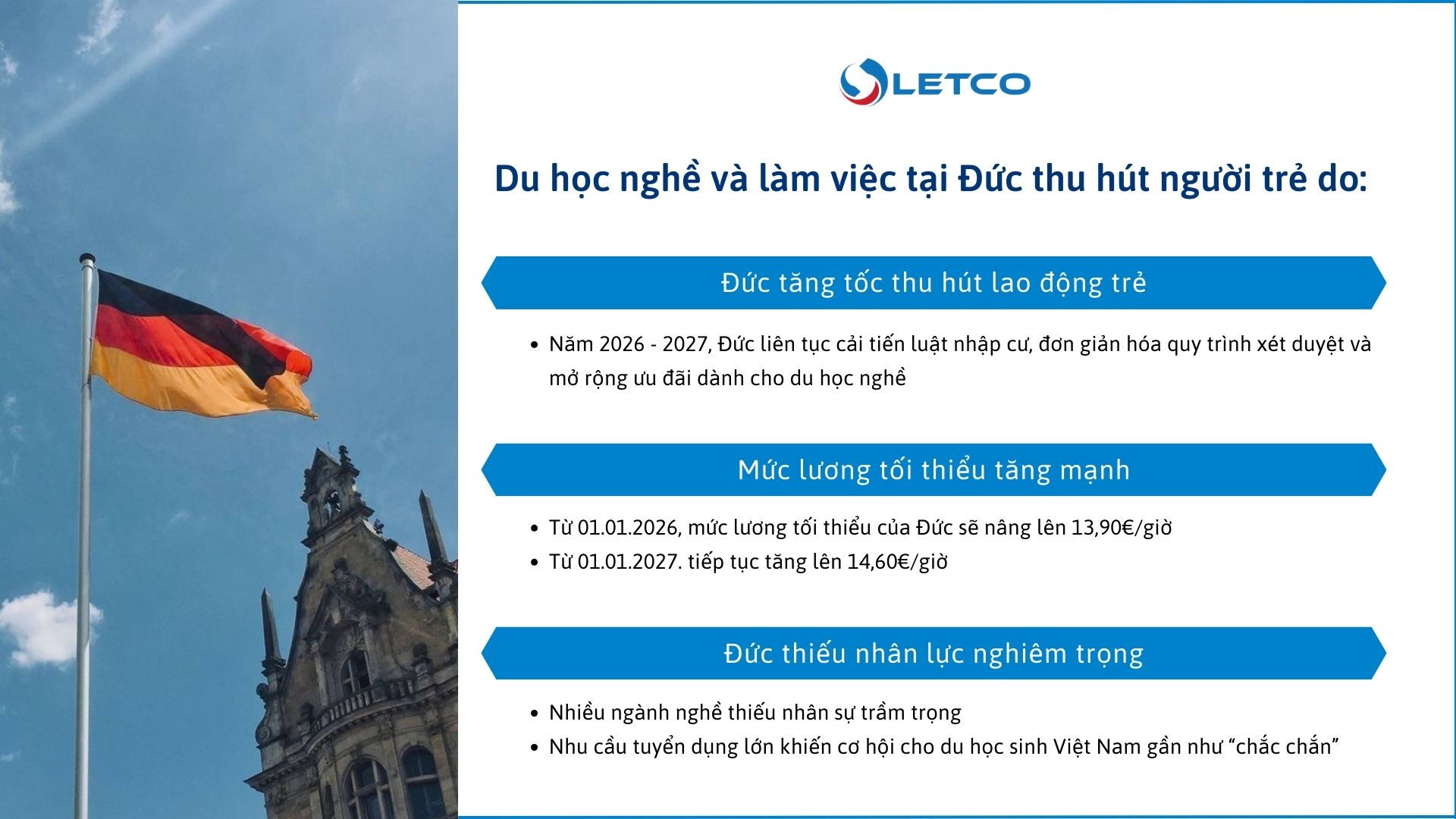 Du học nghề và làm việc tại Đức đang trở thành xu hướng nổi bật khi Chính phủ Đức chính thức tăng lương tối thiểu năm 2026 – 2027, mở ra cơ hội thu nhập và định cư hấp dẫn cho lao động trẻ. Với nhu cầu tuyển dụng lớn, Đức hiện là một trong những thị trường lý tưởng nhất để học nghề và phát triển sự nghiệp bền vững. Trong bối cảnh đó, chương trình du học nghề và làm việc tại CHLB Đức của LETCO được đánh giá cao nhờ lộ trình rõ ràng, quyền lợi vượt trội và tỷ lệ giữ lại làm việc sau tốt nghiệp ấn tượng. Đây là lựa chọn tối ưu cho những ai muốn nâng cao trình độ, đảm bảo việc làm và hướng tới mục tiêu định cư lâu dài tại châu Âu.