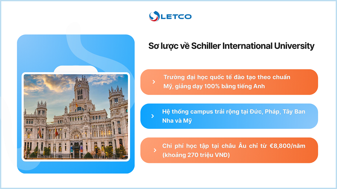 Với hệ thống campus tại Đức, Pháp, Tây Ban Nha và Mỹ, Schiller International University cho phép sinh viên tiếp cận nền giáo dục quốc tế hiện đại, linh hoạt địa điểm học tập và mở rộng trải nghiệm toàn cầu ngay trong cùng một chương trình đào tạo. Đặc biệt, chi phí học tập tại châu Âu chỉ từ €8,800/năm (khoảng 270 triệu VNĐ), phù hợp với nhiều gia đình Việt Nam.