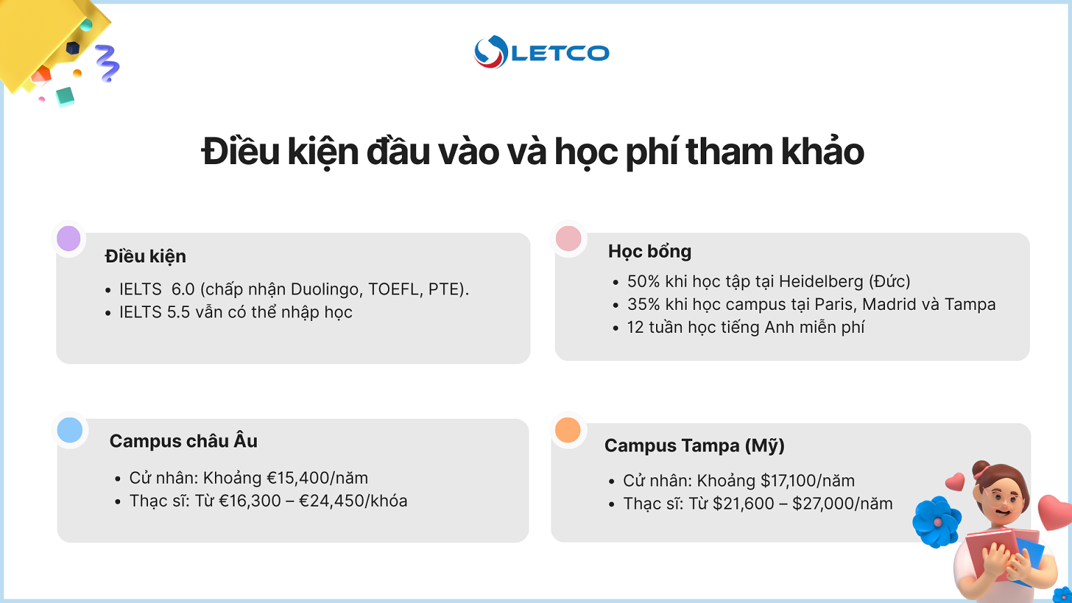 Sinh viên học tập tại Heidelberg (Đức) có cơ hội nhận học bổng lên đến 50%, trong khi các campus tại Paris, Madrid và Tampa áp dụng học bổng lên đến 35%.
