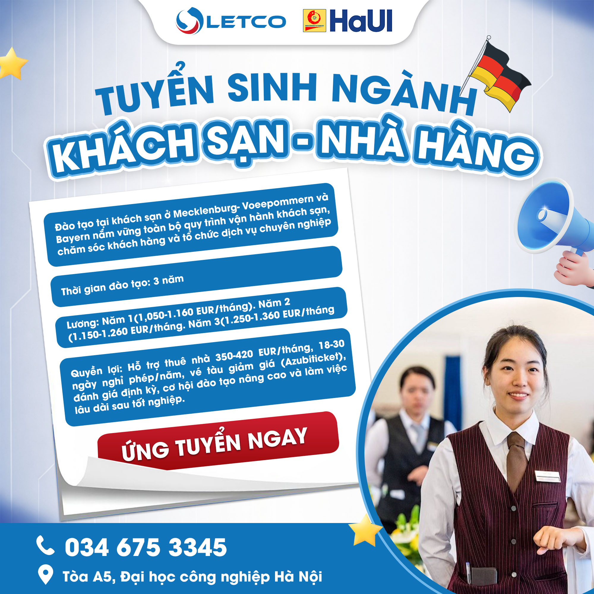 Ngành Khách sạn – Nhà hàng tại Đức luôn nằm trong nhóm lĩnh vực có nhu cầu tuyển dụng cao, đặc biệt trong bối cảnh du lịch và dịch vụ phát triển mạnh mẽ. Khi tham gia chương trình du học chuyển đổi và công nhận bằng, học viên sẽ trải qua thời gian đào tạo 3 năm với mức lương tăng dần theo từng năm, từ 1.050 – 1.160 EUR/tháng ở năm đầu, 1.150 – 1.260 EUR/tháng ở năm thứ hai và đạt 1.250 – 1.360 EUR/tháng ở năm thứ ba.
