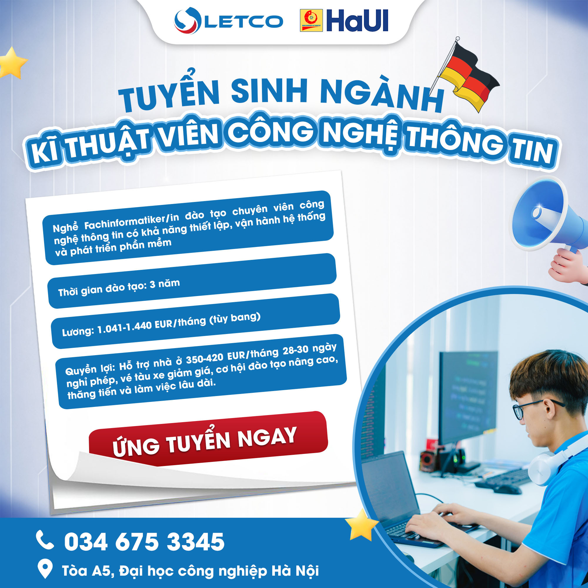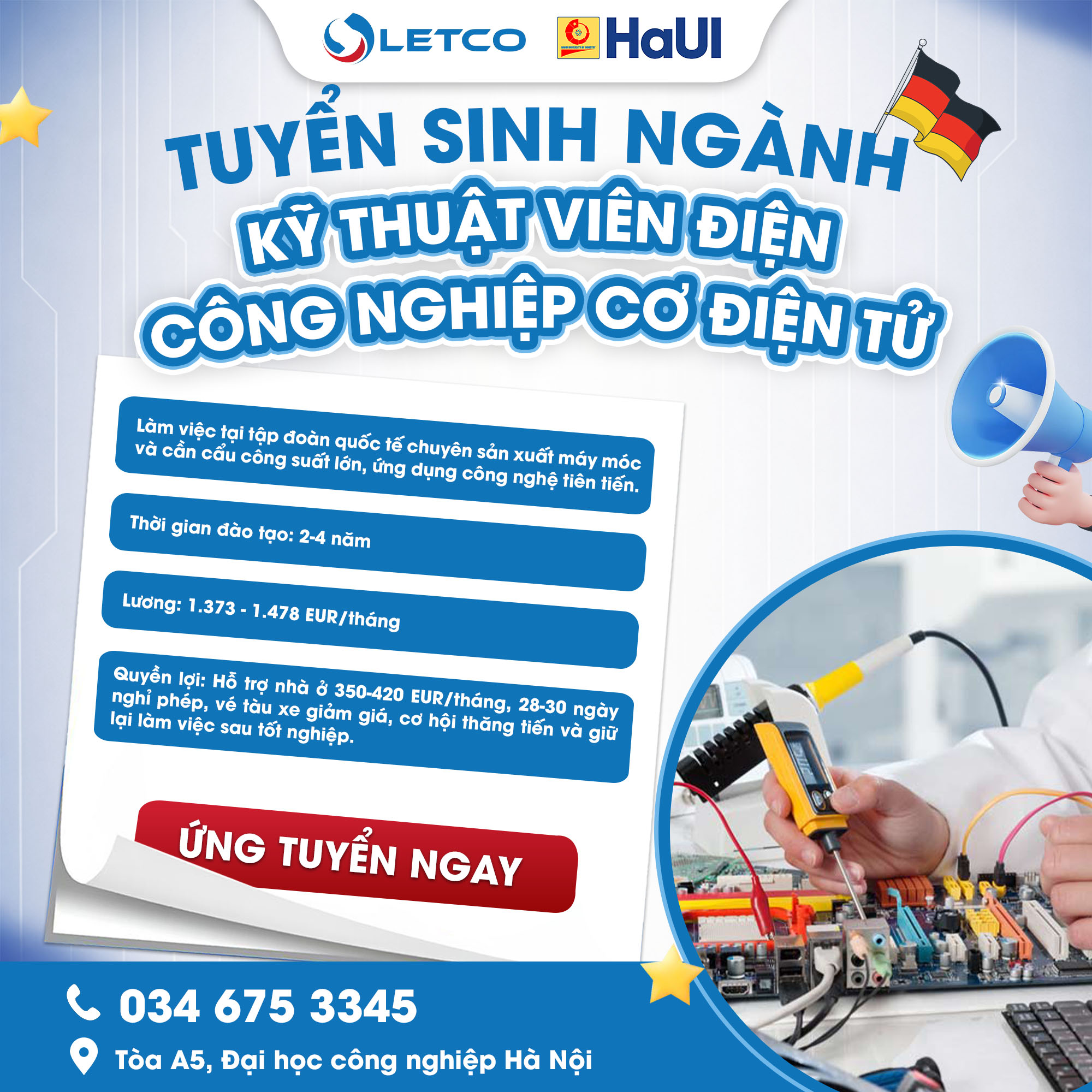 Chương trình Du học chuyển đổi và công nhận bằng tại Đức đang trở thành lựa chọn hàng đầu của nhiều bạn trẻ Việt Nam nhờ tính thực tiễn, cơ hội việc làm rộng mở, thu nhập cao sau tốt nghiệp, định cư lâu dài và chi phí hợp lý. Dựa trên nhu cầu thực tế của đối tác là các tập đoàn công nghiệp, kinh tế lớn của CHLB Đức, LETCO hiện đang triển khai tuyển sinh nhiều ngành nghề “hot”, mang lại thu nhập ổn định và lộ trình phát triển rõ ràng.