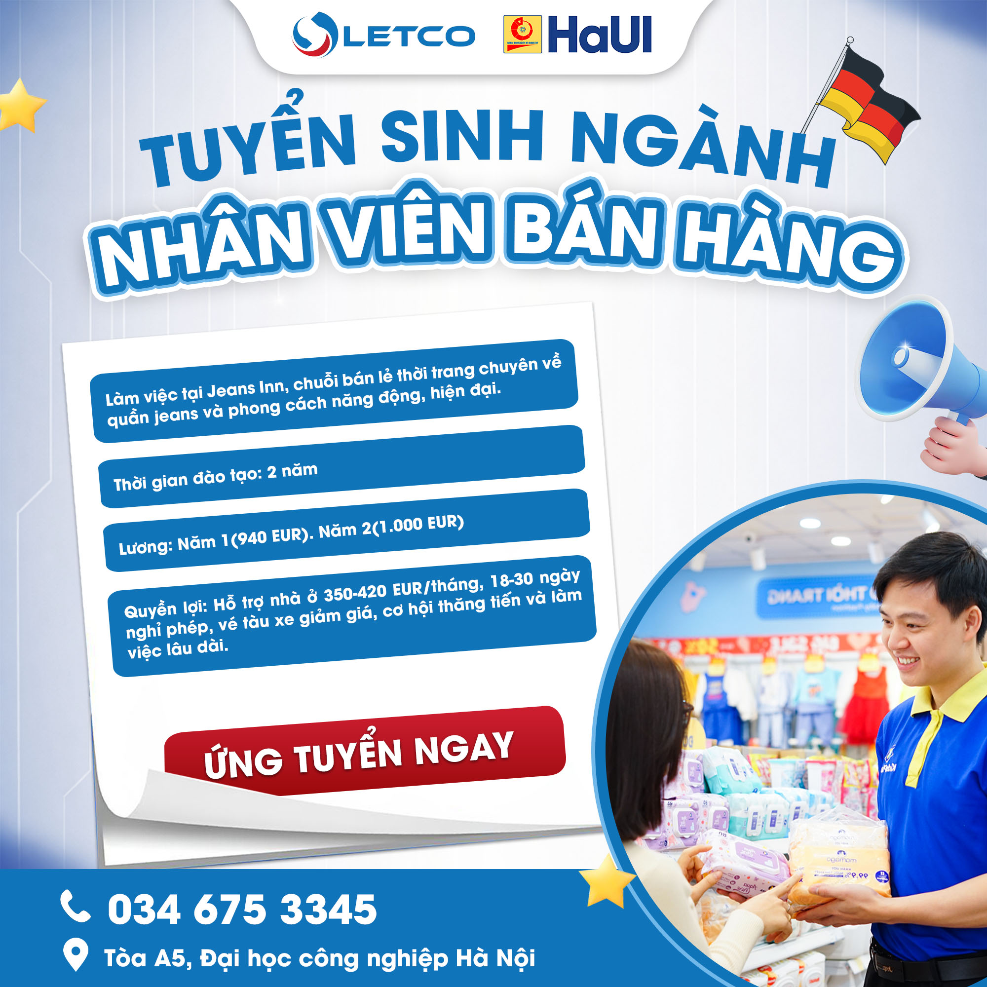 Nhân viên bán hàng trong chương trình du học chuyển đổi và công nhận bằng tại Đức đang thu hút đông đảo bạn trẻ nhờ môi trường làm việc năng động, hiện đại và dễ hòa nhập. Chương trình đào tạo kéo dài 2 năm, với mức lương tốt / mặt bằng thu nhập chung của CHLB Đức. Bên cạnh đó, học viên còn được hưởng nhiều quyền lợi như hỗ trợ chi phí nhà ở, chế độ nghỉ phép theo quy định và cơ hội làm việc lâu dài sau khi tốt nghiệp.