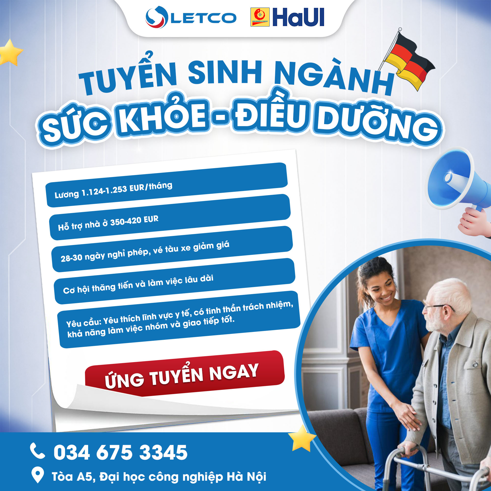 Ngành Sức khỏe – Điều dưỡng đang là một trong những lĩnh vực “khát” nhân lực nhất tại Đức, đặc biệt trong bối cảnh dân số già hóa nhanh và nhu cầu chăm sóc y tế ngày càng tăng cao. Khi tham gia chương trình du học chuyển đổi và công nhận bằng, học viên không chỉ được đào tạo theo tiêu chuẩn châu Âu mà còn nhận mức lương hấp dẫn từ 1.124 – 1.253 EUR/tháng, cùng với hỗ trợ chi phí nhà ở từ 350 – 420 EUR/tháng.